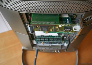 Die Version hier wird mit einer G3-Upgrade-Karte von Sonnet mit 400 MHz und einer Ethernet- und USB-PCI-Karte betrieben. Die Festplatte wurde durch eine 16 GB Compact Flash-Karte und Mac OS 9.1 ersetzt.