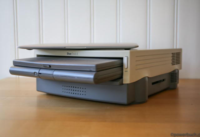 Das Duo-System war ein Zwischending zwischen Laptop und Desktop. Das Gesamtsystem bestand aus einer stationären und einer mobilen Einheit. Arbeitete der Benutzer am Schreibtisch, schob er das mobile Gerät in eine Art Halterung. Die Abmessungen waren beeindruckend. Nicht das MacBook Air war Apples erstes Notebook. Mit dem Anfang der 90er Jahre auf den Markt gebrachten Powerbook Duo hatte Apple ein Notebook in den Abmessungen eines Blattes Papier und weniger als zwei Kilogramm Gewicht.