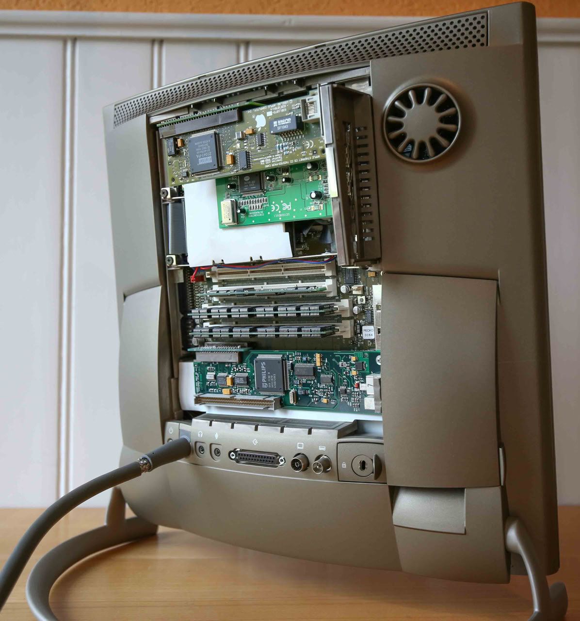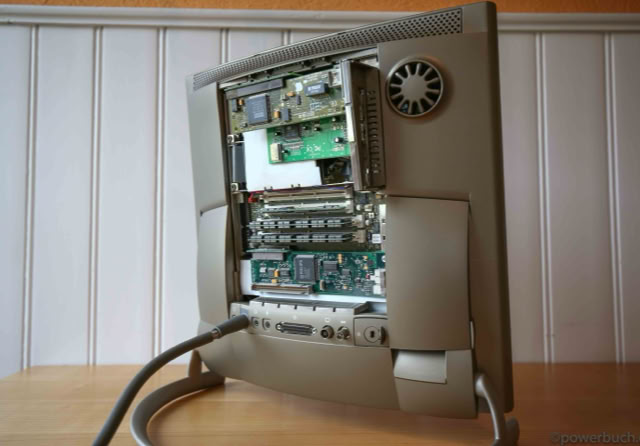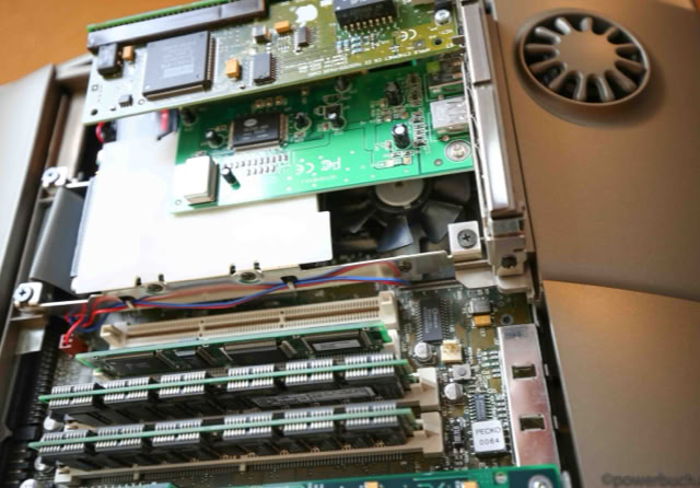 Die Version hier wird mit einer G3-Upgrade-Karte von Sonnet mit 400 MHz und einer Ethernet- und USB-PCI-Karte betrieben. Die Festplatte wurde durch eine 16 GB Compact Flash-Karte und Mac OS 9.1 ersetzt.