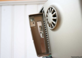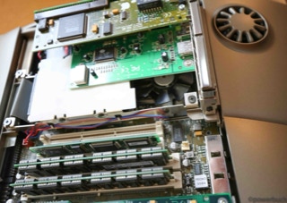 Die Version hier wird mit einer G3-Upgrade-Karte von Sonnet mit 400 MHz und einer Ethernet- und USB-PCI-Karte betrieben. Die Festplatte wurde durch eine 16 GB Compact Flash-Karte und Mac OS 9.1 ersetzt.