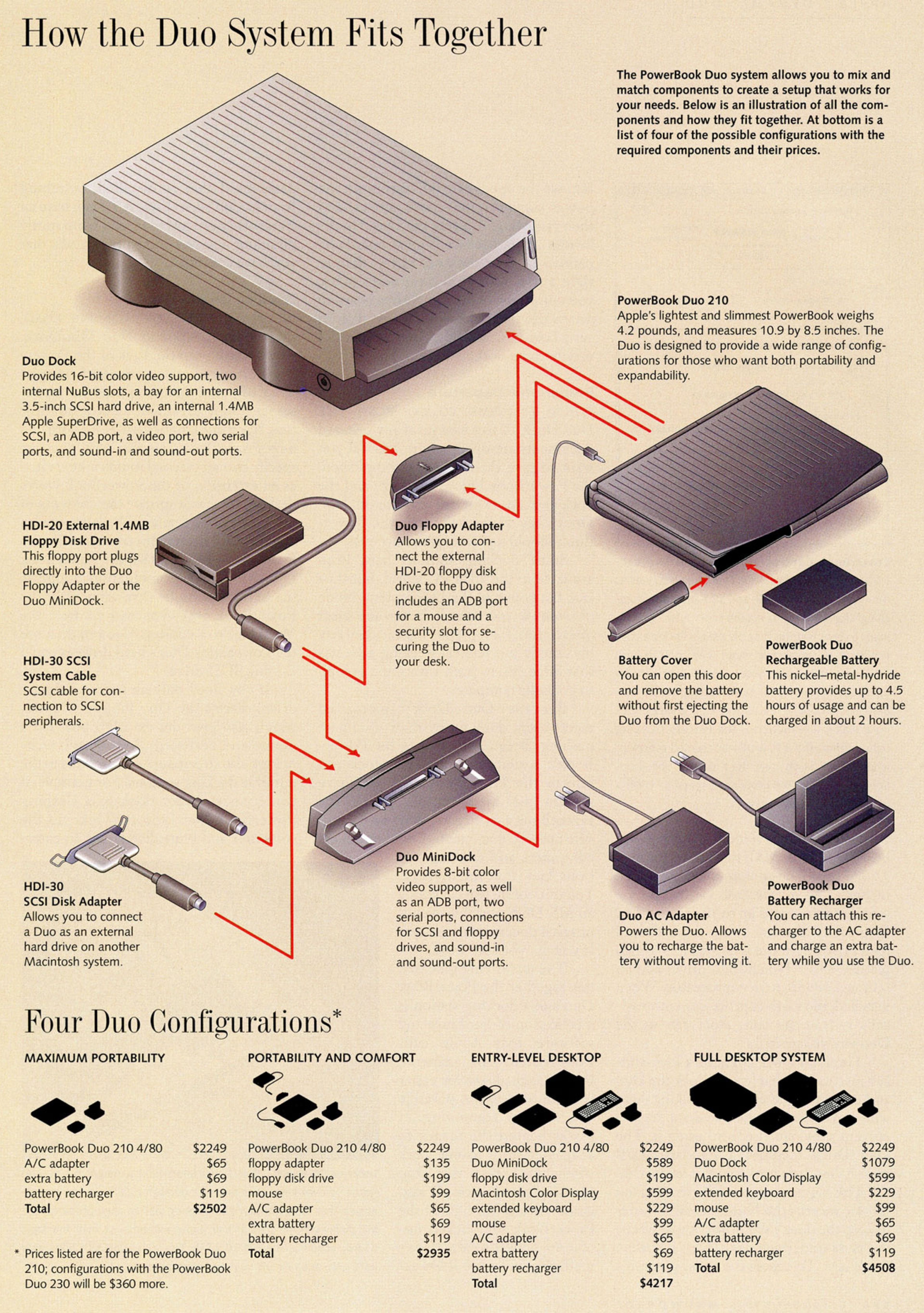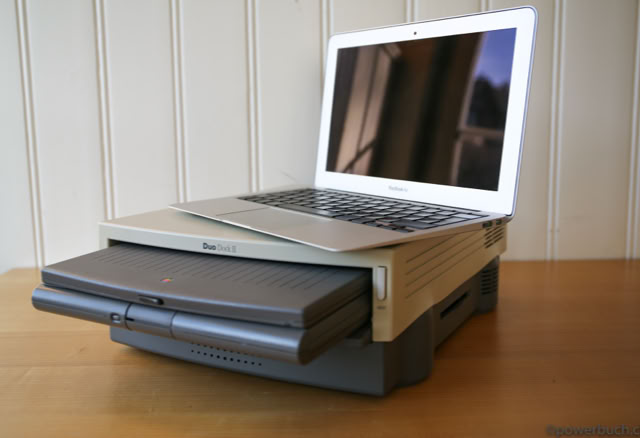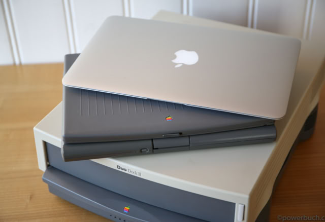 Das Duo-System war ein Zwischending zwischen Laptop und Desktop. Das Gesamtsystem bestand aus einer stationären und einer mobilen Einheit. Arbeitete der Benutzer am Schreibtisch, schob er das mobile Gerät in eine Art Halterung. Die Abmessungen waren beeindruckend. Nicht das MacBook Air war Apples erstes Notebook. Mit dem Anfang der 90er Jahre auf den Markt gebrachten Powerbook Duo hatte Apple ein Notebook in den Abmessungen eines Blattes Papier und weniger als zwei Kilogramm Gewicht.