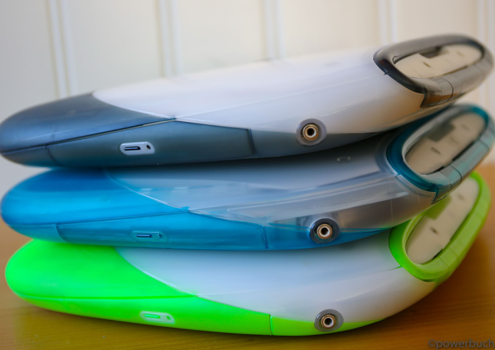 Das Design der ersten Generation der iBooks war eindeutig von Apples Consumer-Desktop, dem iMac, beeinflusst. Das Clamshell-Design erinnerte auch an das eMate 300. Apple setzte seinen Trend fort, transparente farbige Kunststoffe für das Gehäuse zu verwenden und brachte die iBook-Clamshell-Serie in mehreren Farben heraus, beginnend mit Blueberry und Mandarine. Später in der Serie fügte Apple Indigo, Graphit und Keylime hinzu.