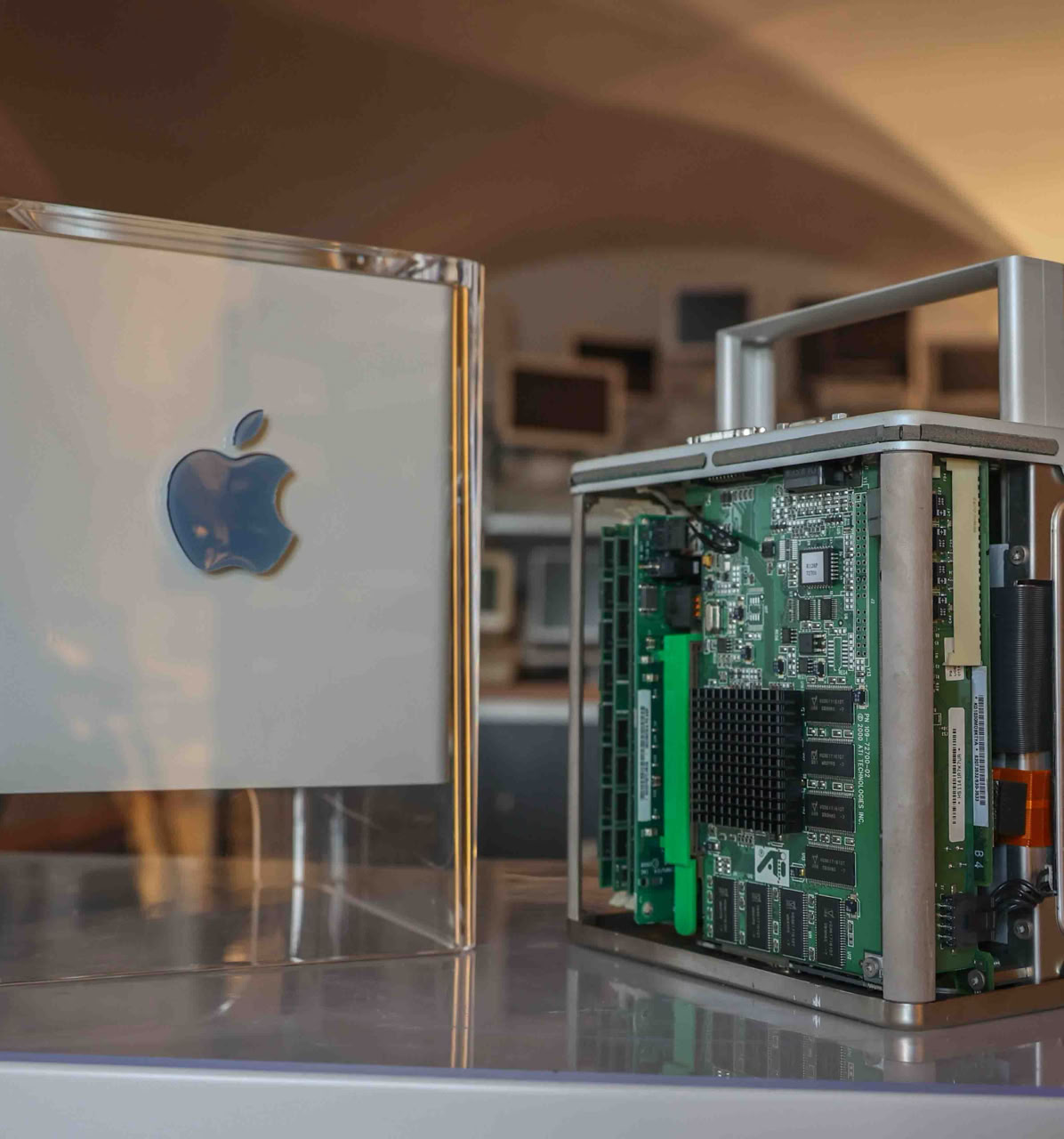 Ein weiteres Gerät mit Sonderstatus ist der Power Macintosh G4 Cube. Er ist, wie so viele Apple-Produkte, ein Design-Meisterwerk: ein lüfterloser Rechner in einem durchsichtigen Gehäuse, begleitet von einem passenden Display. Ein Objekt, das eher wie Kunst als wie ein Computer wirkte. Zu erwähnen ist, dass der Cube mit einem Sensor ausgestattet war, so dass der Startknopf nicht berührt werden musste. Eine schöne Technik in perfektem Design.